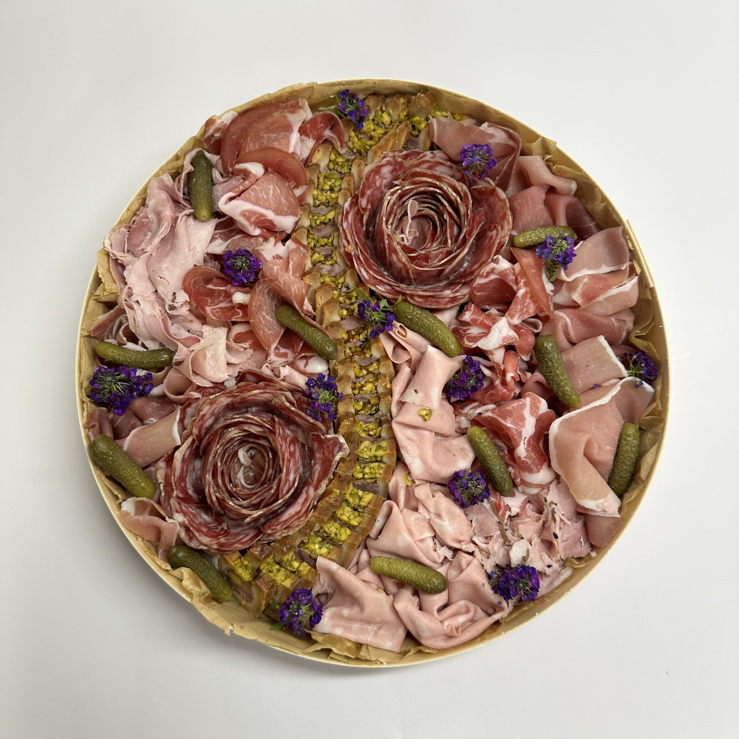 Ce plateau se compose de jambon blanc truffé, pâté croûte Maison Bolard, jambon cru Serrano, coppa IGP, mortadelle et saucisson Valansot.