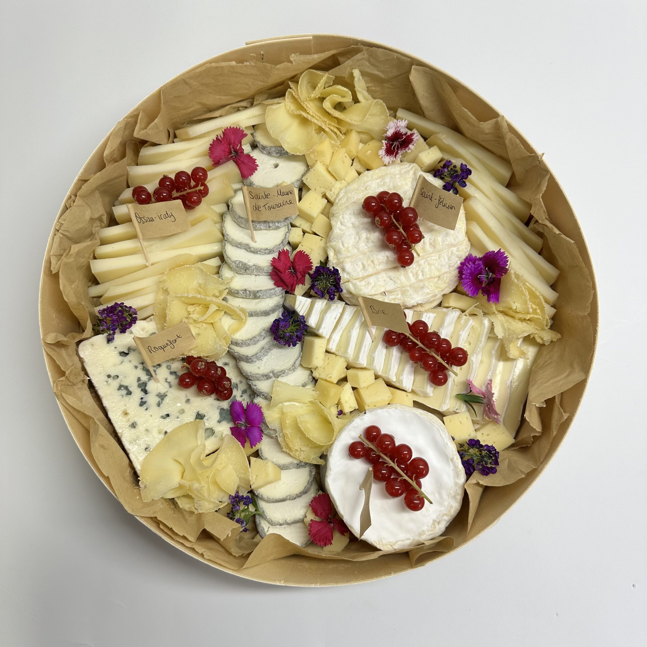 Ce plateau se compose de Saint-Maure de Touraine, Saint-Félicien MOF, Ossau-Iraty, Tomme de Savoie, Roquefort AOP, Brie, Brillat-Savarin IGP et Tête de moine.